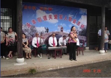 2008年8月29日下午两点,天空漂着蒙蒙细雨,地处秀南居委会辖区内的杜氏宗祠内人声鼎沸、热闹非凡,原来是永丰街道红十字关爱盲人联谊会在这里举行。参加此次联谊会的有市红十字会副会长李明磊、区红十字会领导以及永丰街道红十字会等领导,还有秀南居民区内的18名盲人、盲人家属代表、助残员。