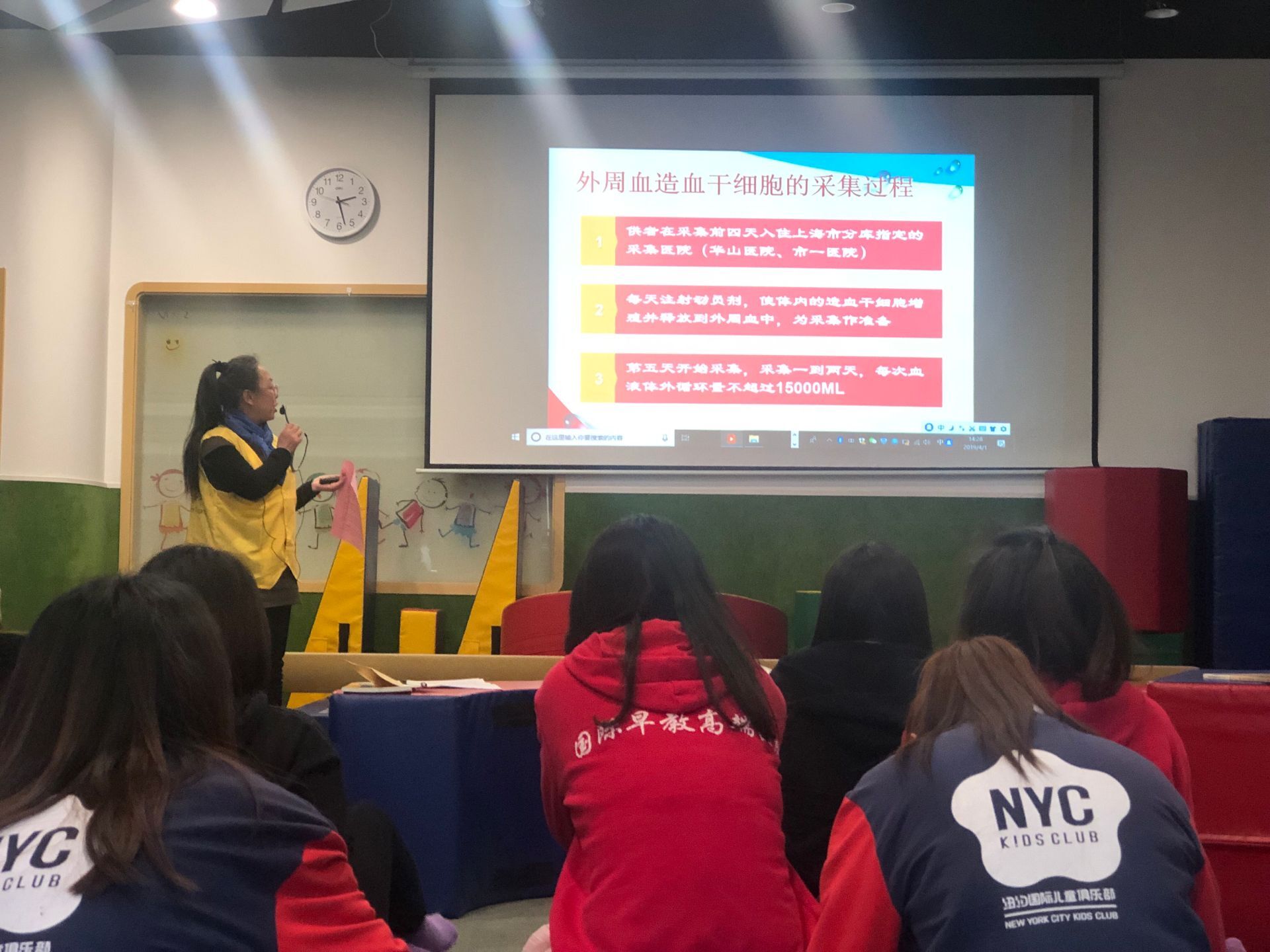 为进一步弘扬“人道、博爱、奉献”的红十字精神,发动更多的青年加入到造血干细胞捐献志愿者的队伍中来,让更多的白血病患者重获生命的希望,4月8日下午,方松街道红十字会应邀在东鼎纽约国际儿童俱乐部举办造血干细胞捐献知识讲座,共有35名俱乐部老师参加。