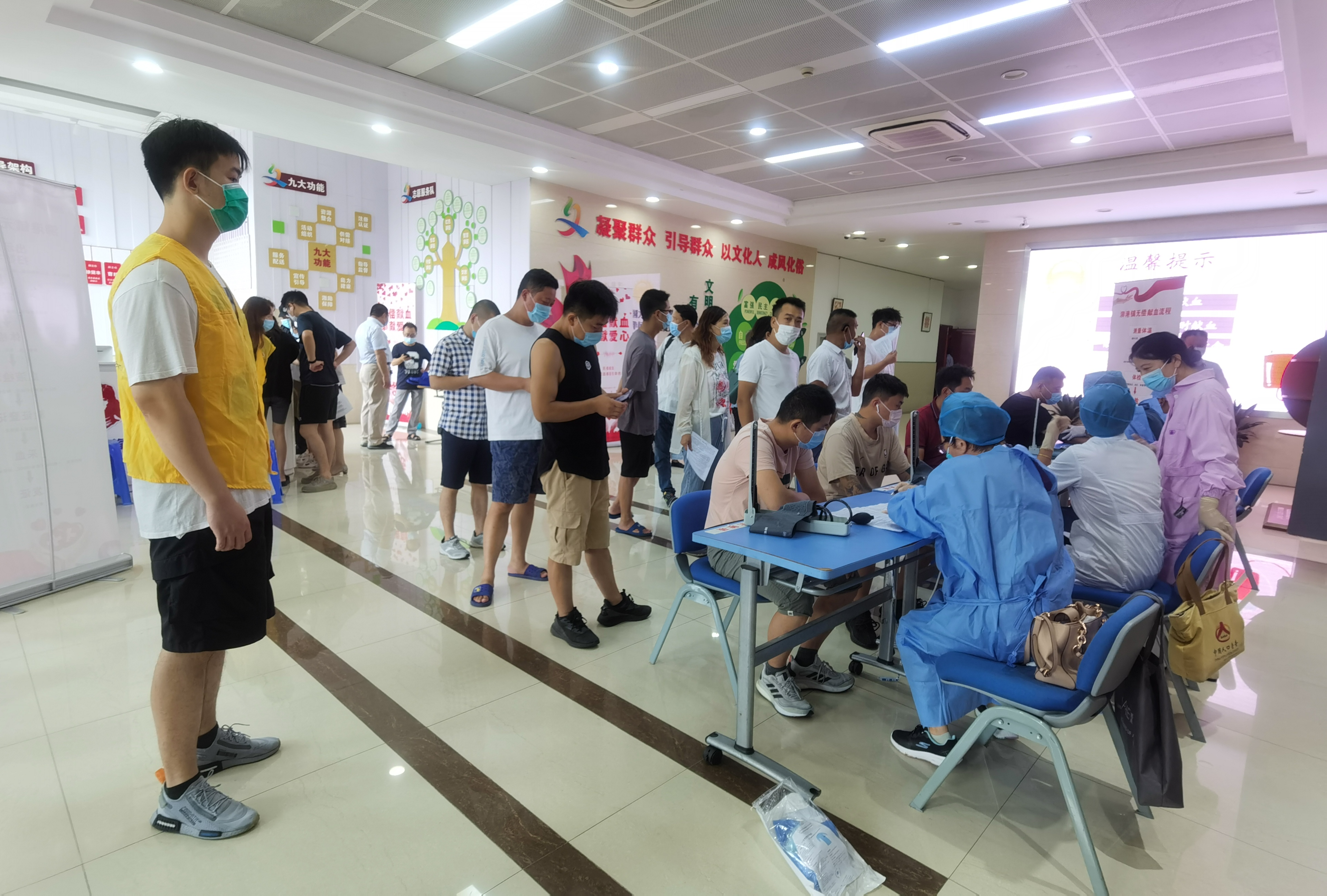由于今年疫情的特殊性,本次献血现场落实了严格的疫情防控措施。大厅内,在红十字志愿者们的引导下,献血志愿者们有序地进行着登记、量血压、抽验血等检查环节。在献血现场,献血者们依次来到采血处,捋起袖子,伸出胳膊,献出自己的爱心,在高温酷暑里传递温暖。不管是“献血老将”,还是“热血新兵”,脸上无不洋溢着自豪,他们纷纷表示,无偿献血是利人利己的好事,还要带动身边更多的人共同参与这项公益事业。副镇长马逸欣来到现场看望和慰问了献血志愿者和工作人员,嘱咐工作人员要做好后勤保障工作,并向无偿献血者表达了崇高的敬意。工作人员及红十字志愿者们在现场为大家做好后勤保障工作,向献血者宣传有关献血常识,叮嘱他们在献血之后的有关注意事项。