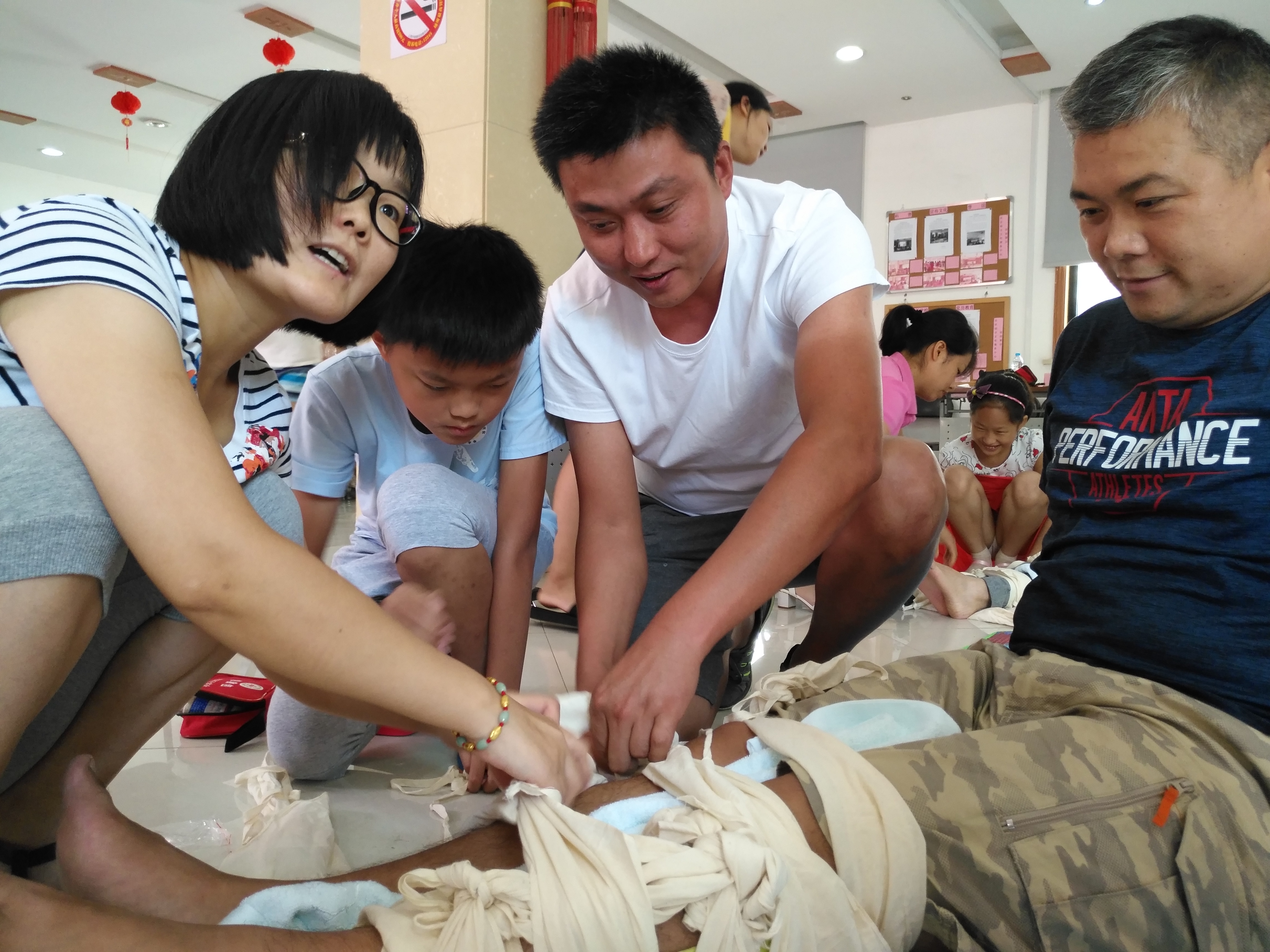每组家庭都全身心地投入到模拟情景中,仿佛自己就在事发现场,各位小朋友脑洞大开,原来生活中好多东西都可以用来急救包扎,正在用自己所学的急救知识进行救死扶伤。