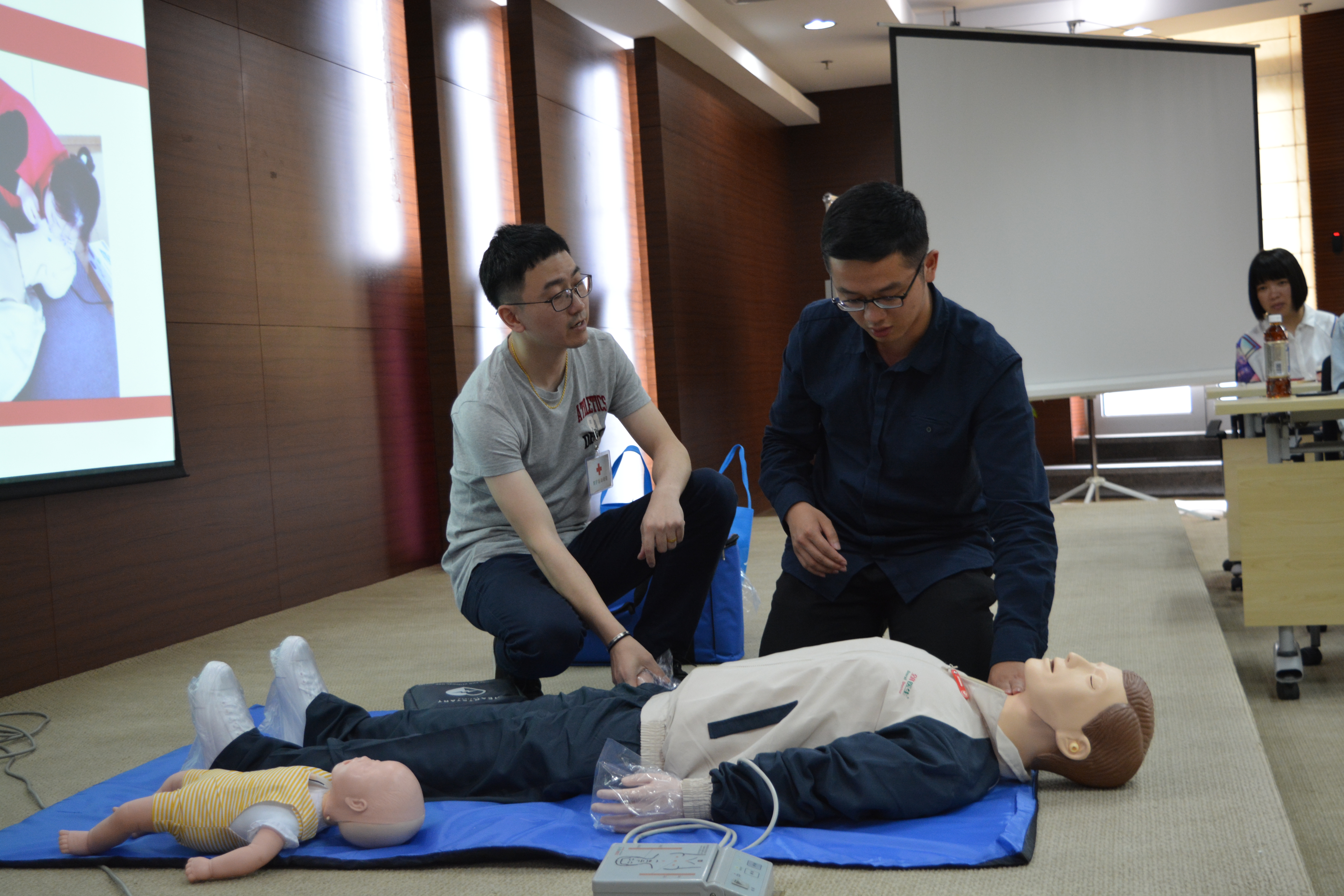 此次培训主要分为四个部分展开。第一:红十字发展概述,第二:心肺复苏及AED使用,第三:创伤止血包扎,第四:气道异物梗阻。张老师将理论与实践相结合,对每一部分内容都做出了严格的示范,耐心地对学员的问题作出解答。学员们也特别积极,踊跃参与现场模拟人的急救演示。