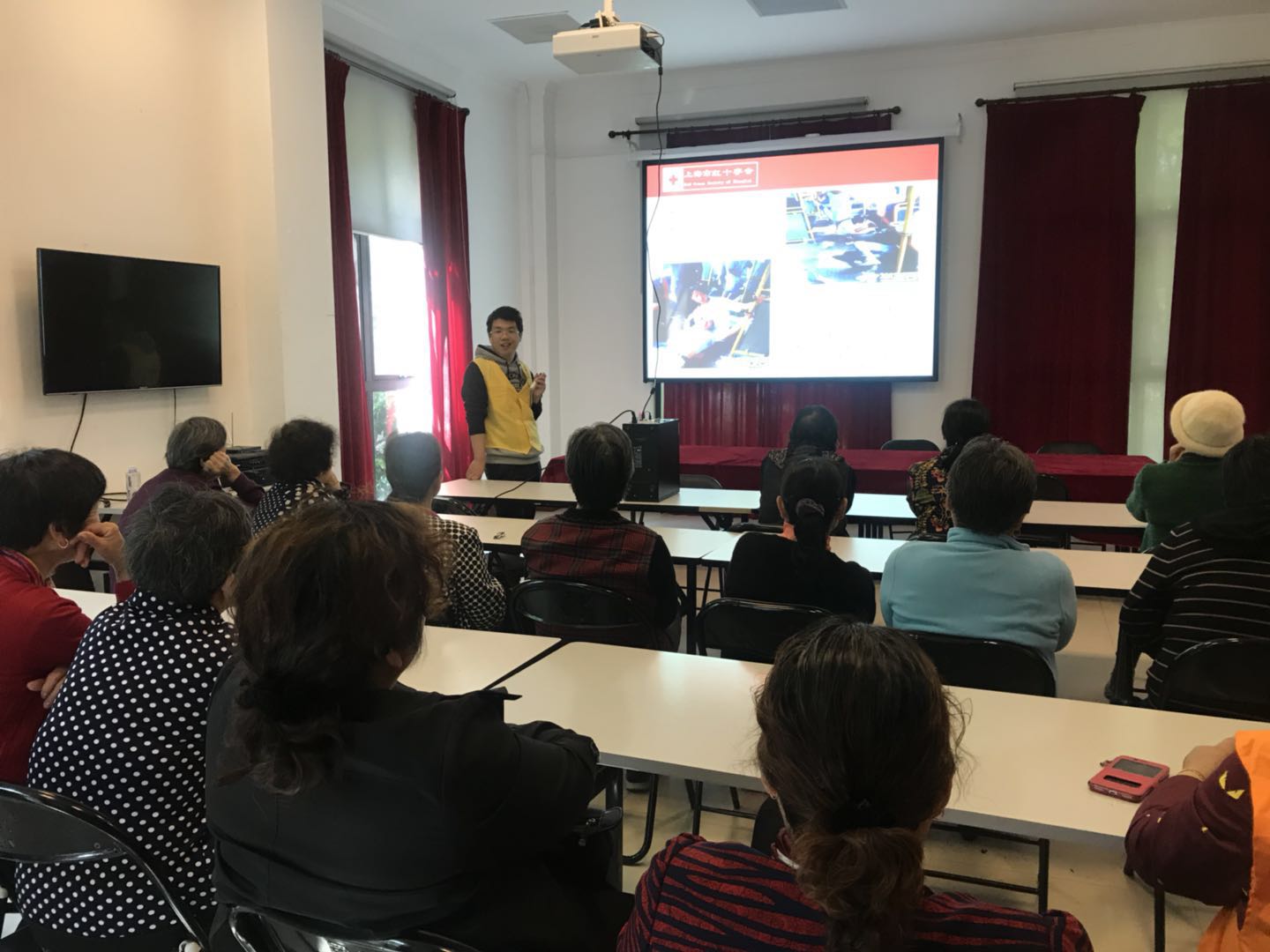 盛老师先为大家讲解了现场急救、心肺复苏、呼吸道异物的排除方法、创伤救护、止血、包扎、固定、搬运伤员等基本理论知识,又用模特为居民进行了现场的急救示范。整个教学过程中老师很注重理论与实际操作的相结合,大家都听得很认真,课堂秩序井然。