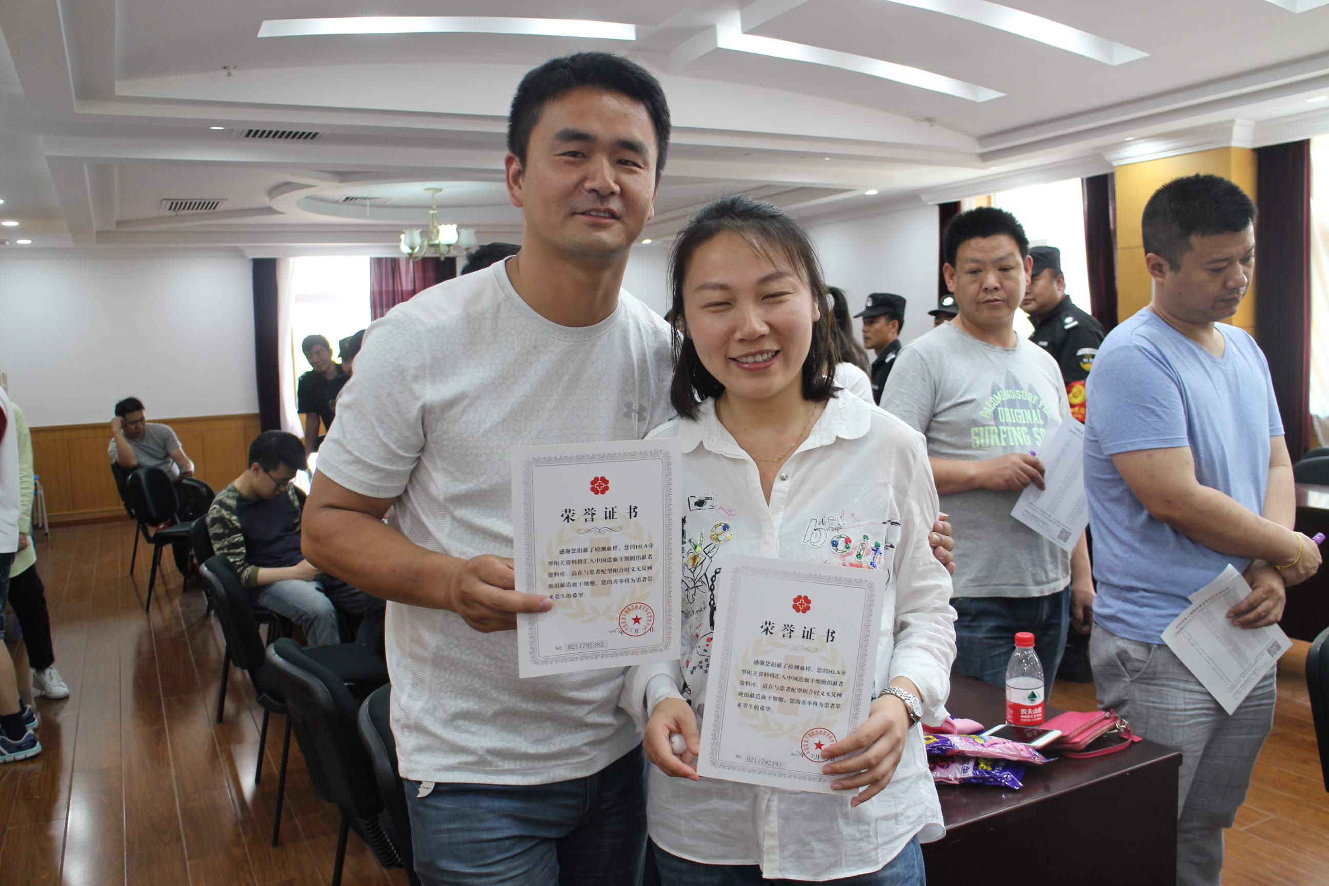 造血干细胞移植是挽救白血病、重症再生障碍性贫血等重症患者生命的重要方法和有效措施,因为配型成功概率极低,需要更多的志愿者参与捐献。今年血样采集的志愿者中,有小区物业的保安、有居委会干部,还有正巧路过采血所在的会议室而前来采血的机关干部……小胡和小吴是一对同在居委会工作的贤伉俪,今年他们携手同来参加血样采集,当有点晕血的小吴在采血时,小胡在一边拍照:“拍个照回去给儿子看,让儿子看到爸爸有多棒!”
