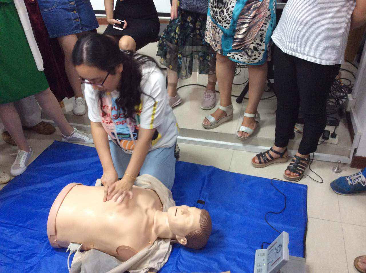 区红十字会讲师为学员们讲解了心肺复苏、创伤救护、排除气道异物等基本技能,并进行了理论知识和实践操作考核,经过两天的学习,学员们已基本掌握了手掌八字包扎、螺旋式包扎、人字形包扎及三角巾的大手挂、小手挂等方法,在实践操作环节大家互相做创伤救护、止血包扎练习、模拟人心脏复苏操作。学员们热情高涨,边听边记边操作,表现出了极大的兴趣。