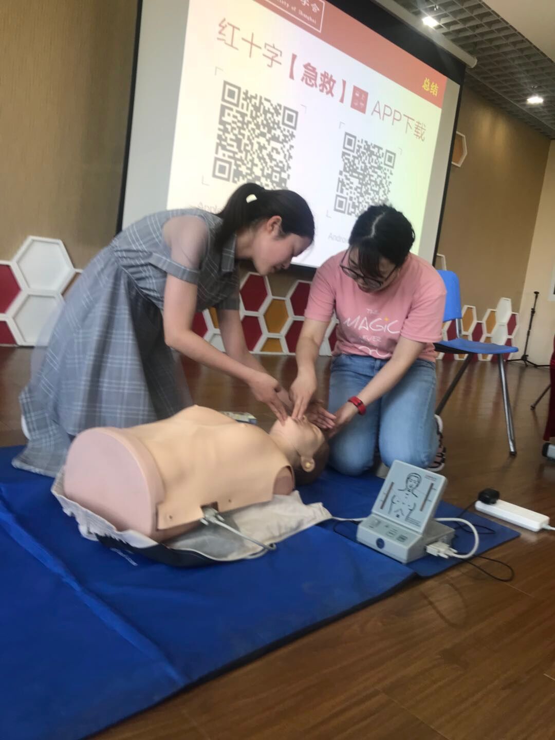 实践操作调动了大家参与的积极性,纷纷上台,认真练习心肺复苏的急救技能,希望能在关键时刻凭借这一技能拯救更多生命。