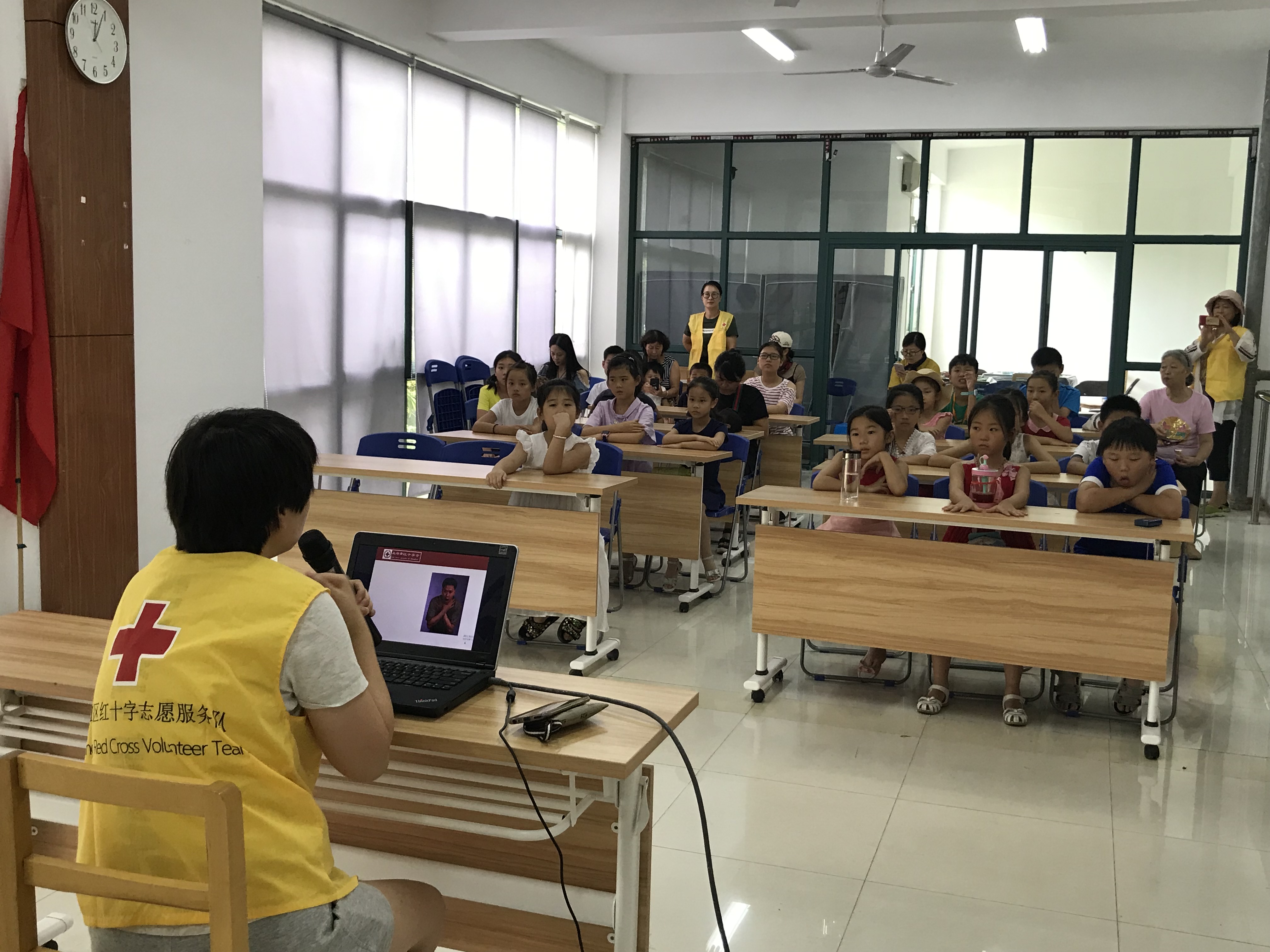 8月22日下午,九里亭街道红十字会与朗庭居委会结合学生暑期活动组织开展了“红十字急救培训”讲座。本次活动由红十字会师资高医生为社区孩子们授课。