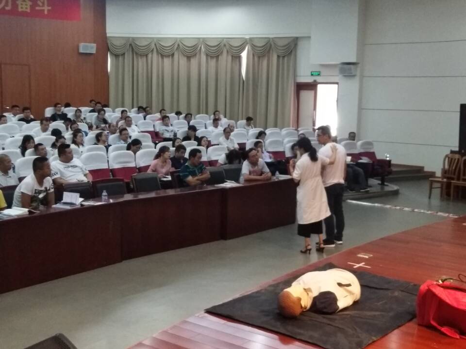 此次讲课中镇社区卫生服务中心王医生利用模拟人,结合企业生产中碰到的案例生动地讲述了心肺复苏、创伤急救的操作方法,演示了单人胸外按压、口对口人工呼吸以及创伤救护等现场急救技术的具体操作要领。