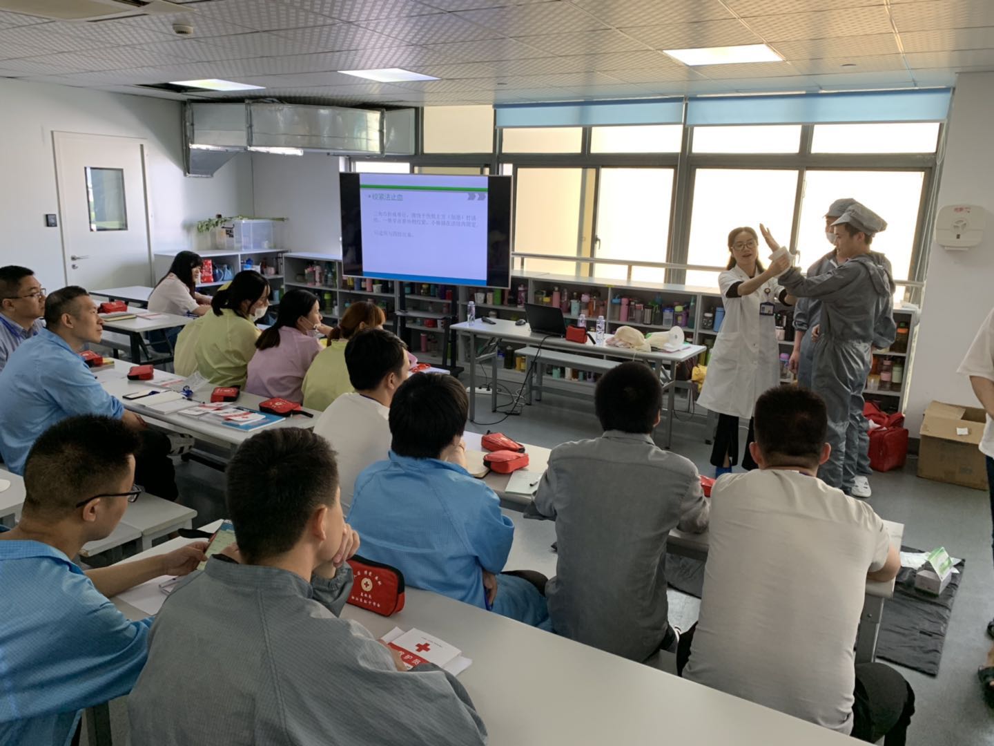 培训会上,老师结合企业特点,利用精心准备的PPT课件,围绕应急救护主题,采取理论知识教授与救护技能实际操作相结合的方式,对参训人员进行了心肺复苏、止血包扎、骨折固定、气道异物梗塞等应急救护知识的讲解、演示,并采用模拟人和教具,手把手指导学员们练习救护中的操作规范及细节,在练习中不断巩固学习内容,提升实际操作能力。整个培训过程中,特别是现场互动环节,参训学员的学习能动性和积极性十分高涨,争先恐后学习操作技能,虚心地向老师请教。