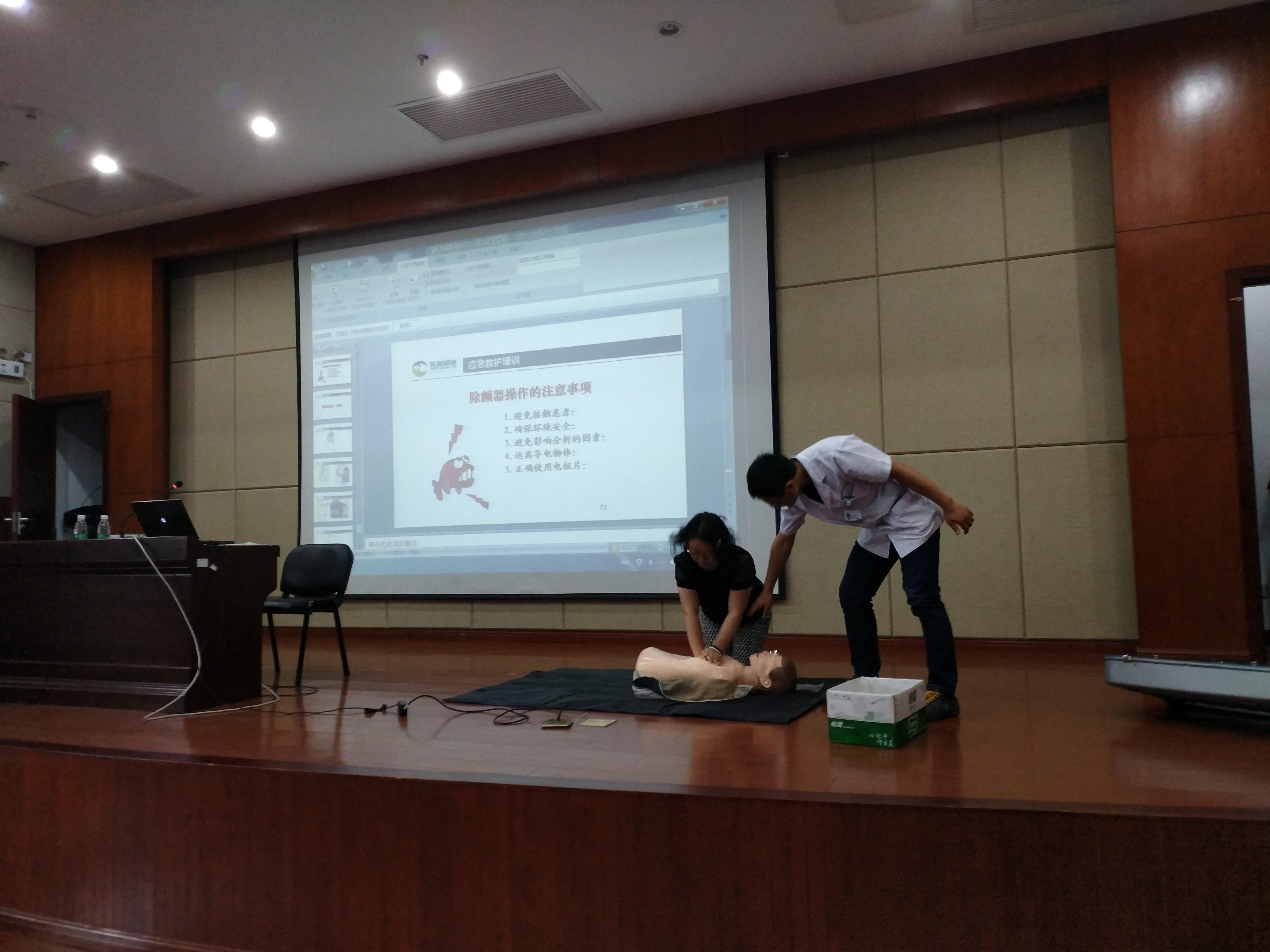 培训过程中,张老师首先从“救护新概念”、“心肺复苏”、“气道异物梗塞”、“创伤救护”和“意外事件”等理论知识进行了详细的介绍和讲解,并为大家一一演示了心肺复苏、AED自动体外除颤仪以及常见止血,包扎和骨折固定的急救方法。讲解结束后,学员们踊跃上台练习心肺复苏技术和AED的操作,张老师在一旁耐心指导并及时指正错误,加深学员们对操作要点的掌握,现场气氛热烈。