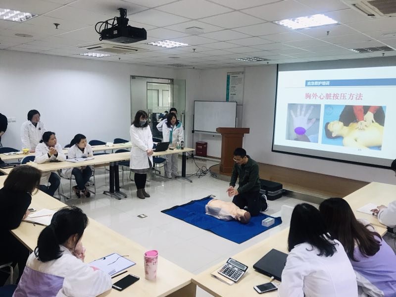 张医生就心肺复苏、气道异物梗阻急救、意外伤害等应急技能进行了详细的讲解,并用人体模型为学员们示范讲解心肺复苏、创伤救护等常用的急救技巧。现场气氛活跃,学员积极参与,在模拟的情景中,实际操作,取得了不错的教学效果。