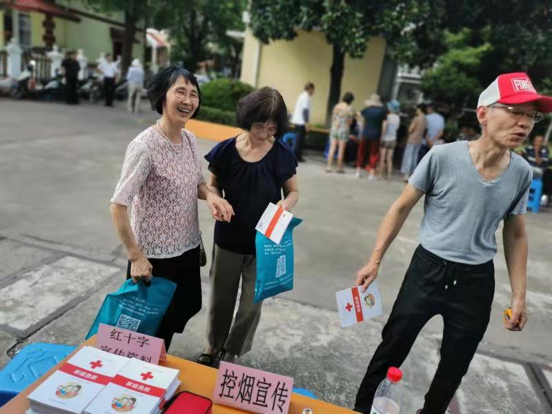 活动当天,工作人员及志愿者通过悬挂标语、放置展板、发放宣传资料等形式,宣传红十字知识,普及应急救护常识,并向居民们发放了家庭急救小常识等宣传材料,细心地为前来的群众宣传答疑。