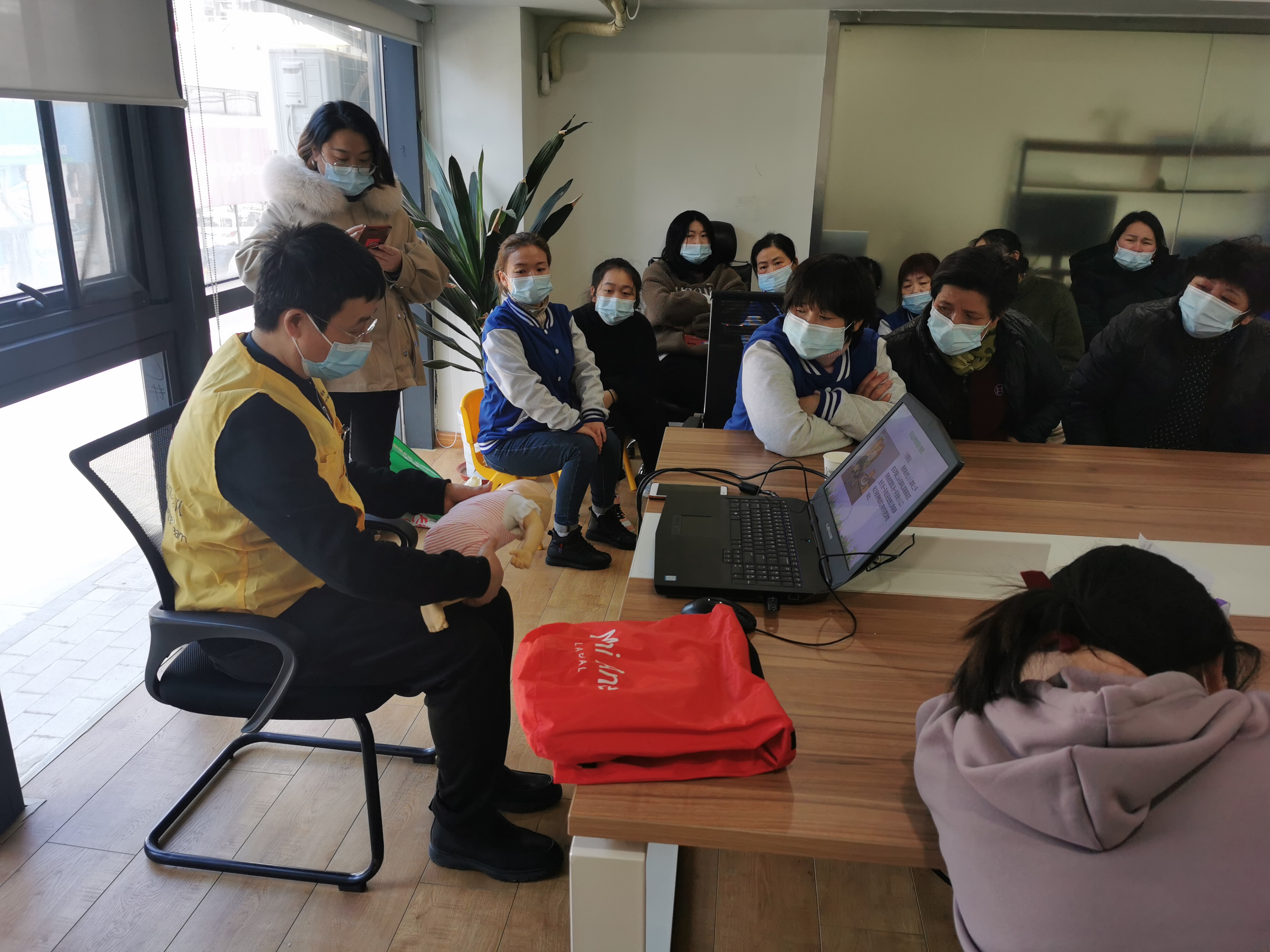 培训中,红十字会救护培训师资张春连结合幼儿园常见的意外伤害,采用理论知识讲解、现场情景模拟和实操等方式,传授了心肺复苏、创伤救护、气道异物梗阻等救护知识和技能,同时详细地讲解了AED的使用方法以及外伤包扎的技巧。