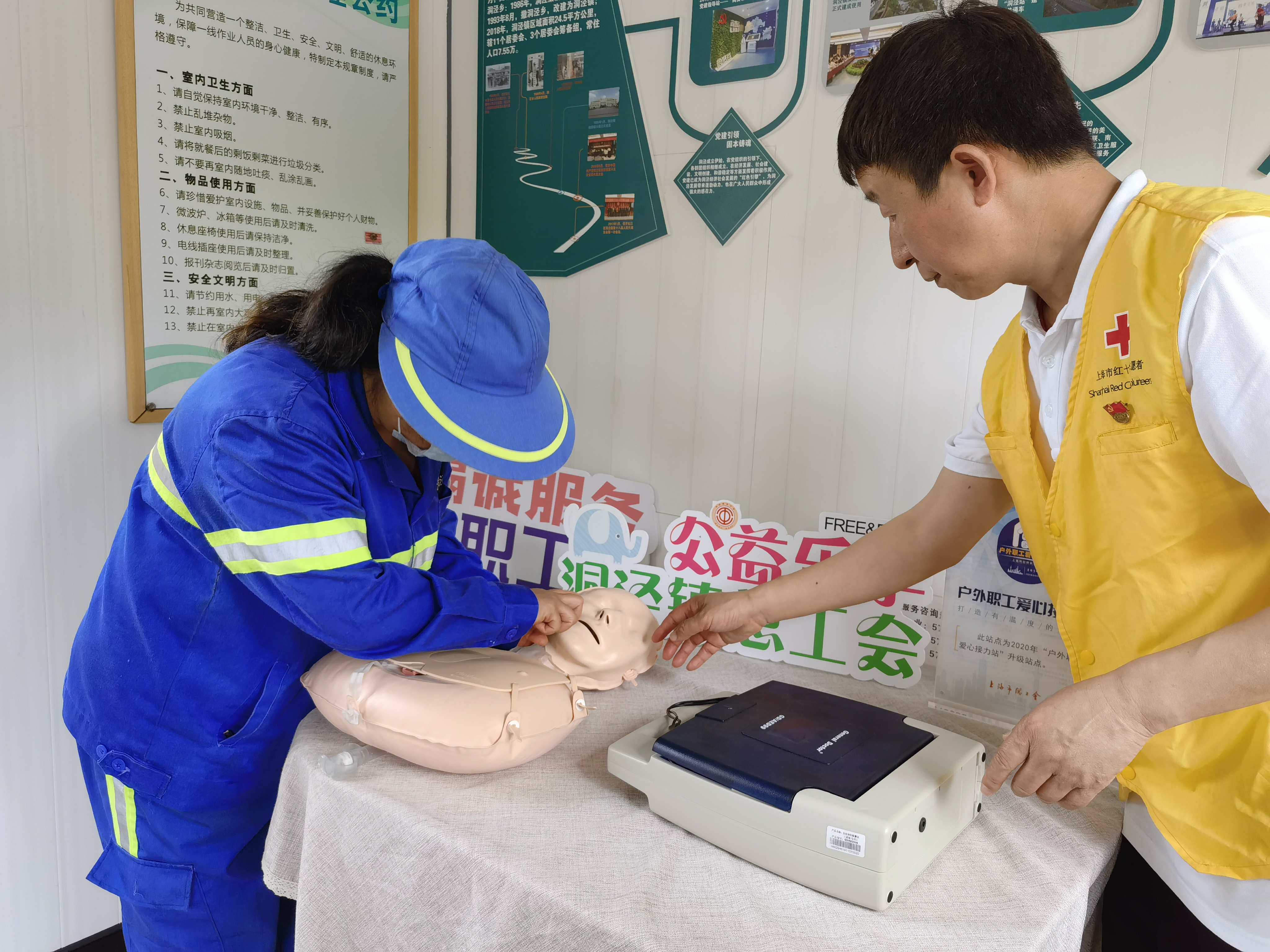 4月28日,洞泾镇红十字会来到镇环卫所,为20多名户外职工开展了急救课堂进爱心接力站服务点的活动。