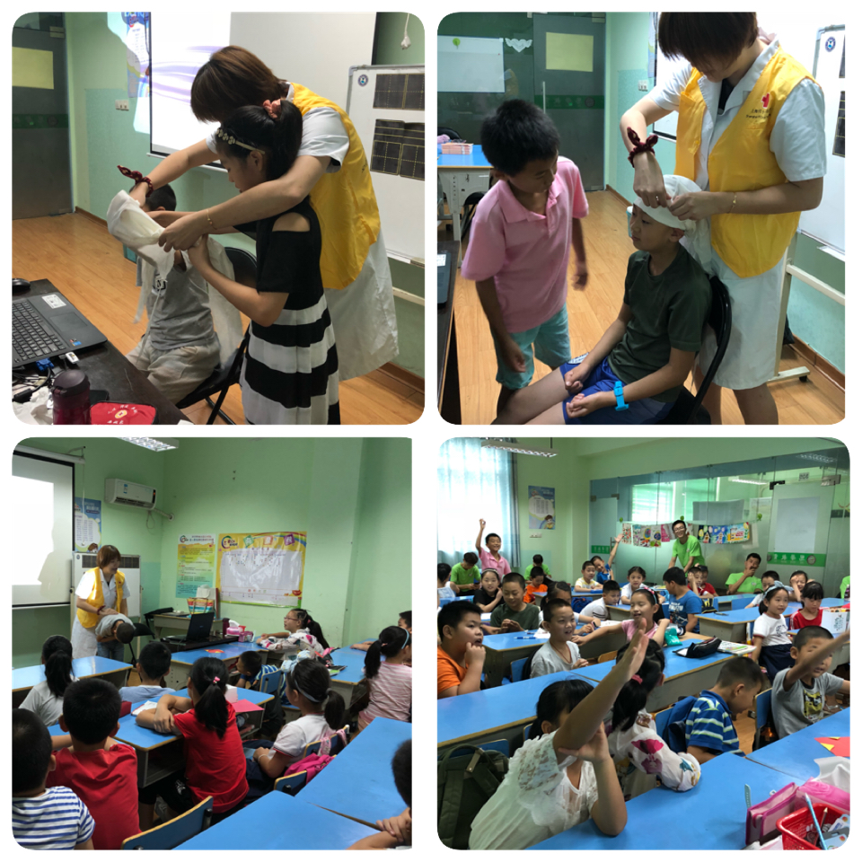 培训中,针对暑期青少年的特点,佘雯医生用通俗易懂的语言,丰富的社会案例,详细地讲解在突发火灾、溺水、触电、异物梗塞及外伤急救中的止血、包扎等应急知识,同时让学生们逐个进行了现场止血包扎演练。