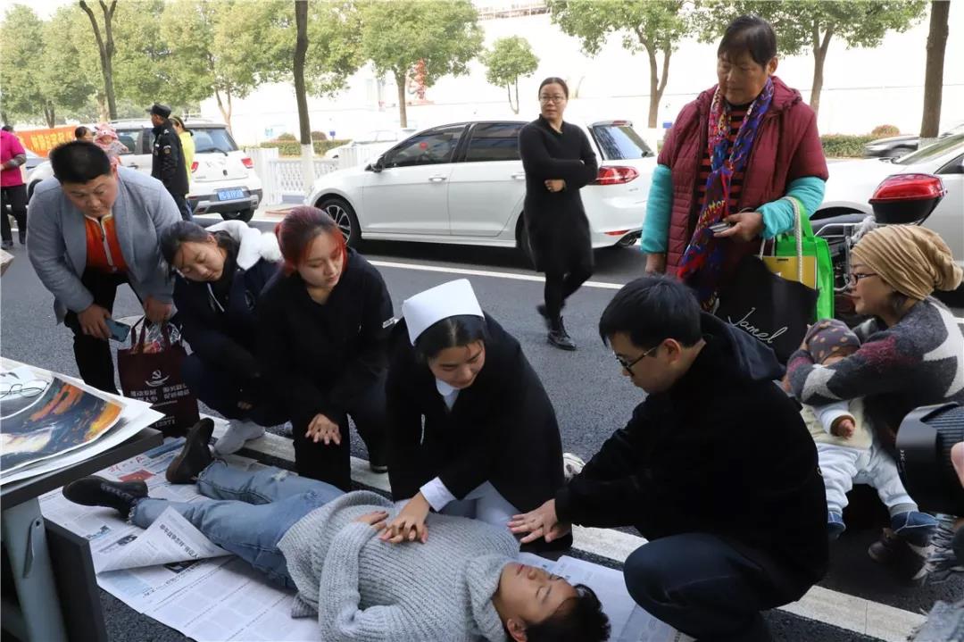 现场还有立达学院的学生志愿者们在现场为市民示范心肺复苏的操作方法。居民们认真听讲,在学生志愿者的指导下进行操作。
