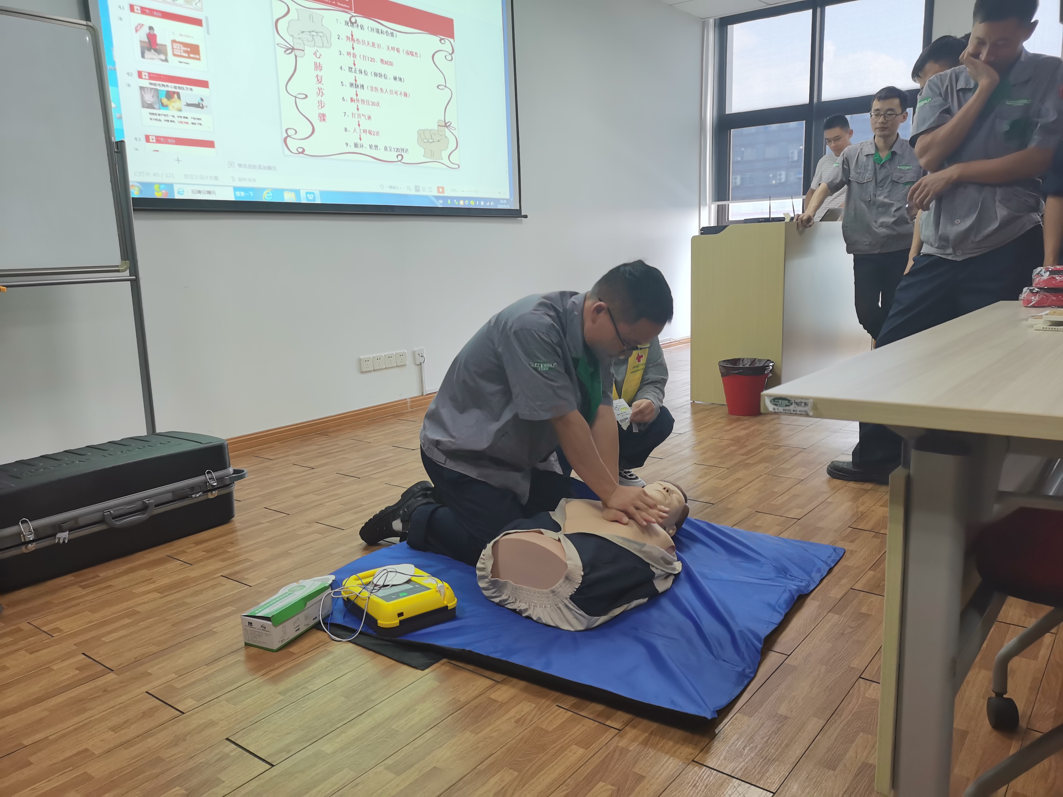 培训中,红十字救护培训师资吴佳燕详细讲解了现场救护、心肺复苏、人工呼吸等紧急救护的方法、步骤及注意事项,并用人体仿真模型进行心肺复苏术示范演示,示范了如何呼叫昏迷患者,如何打开患者口腔气道进行人工呼吸及心脏按压的规范手势、力度等要点。