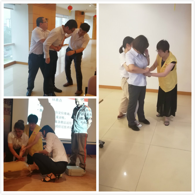 经过理论知识培训后,培训老师围绕着如何使用自动体外除颤仪,在出血后如何正确包扎,怎样判断骨折、扭伤、脱臼等方面做了充分讲解,还在现场示范指导了胸部冲击法和伤口包扎的技巧。讲解结束后,前来听课的员工们纷纷结成小组,通过不断练习、操作,展示自己在课堂上学习到的急救技能。