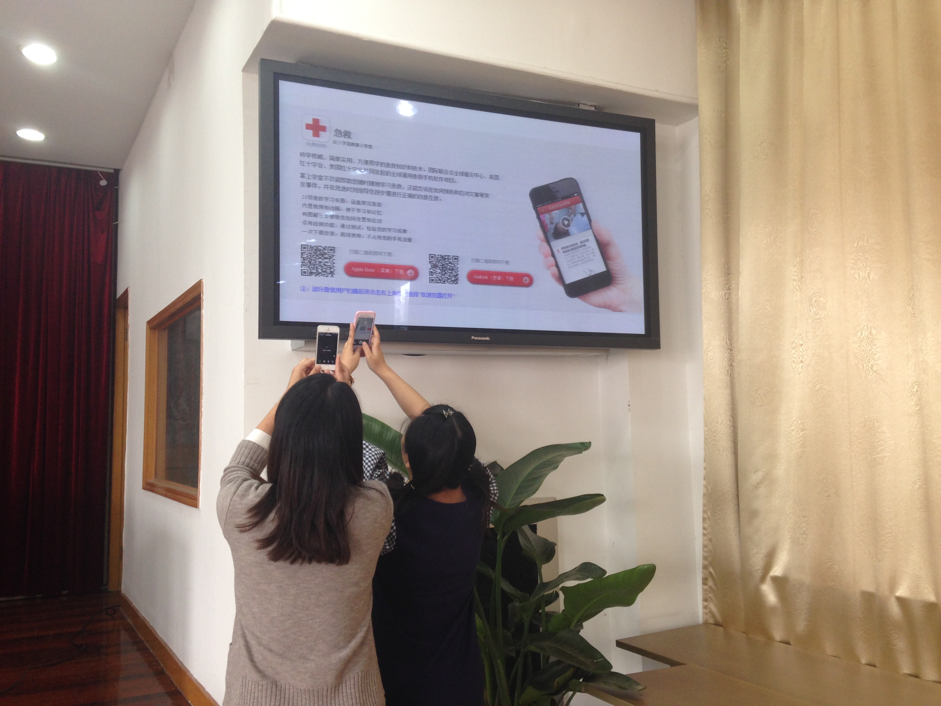 培训开始之前,镇红会工作人员将”红十字急救掌声学堂”的宣传页面和二维码投影在幕布上,吸引了不少与会人员的兴趣,大家纷纷拿出手机下载安装。