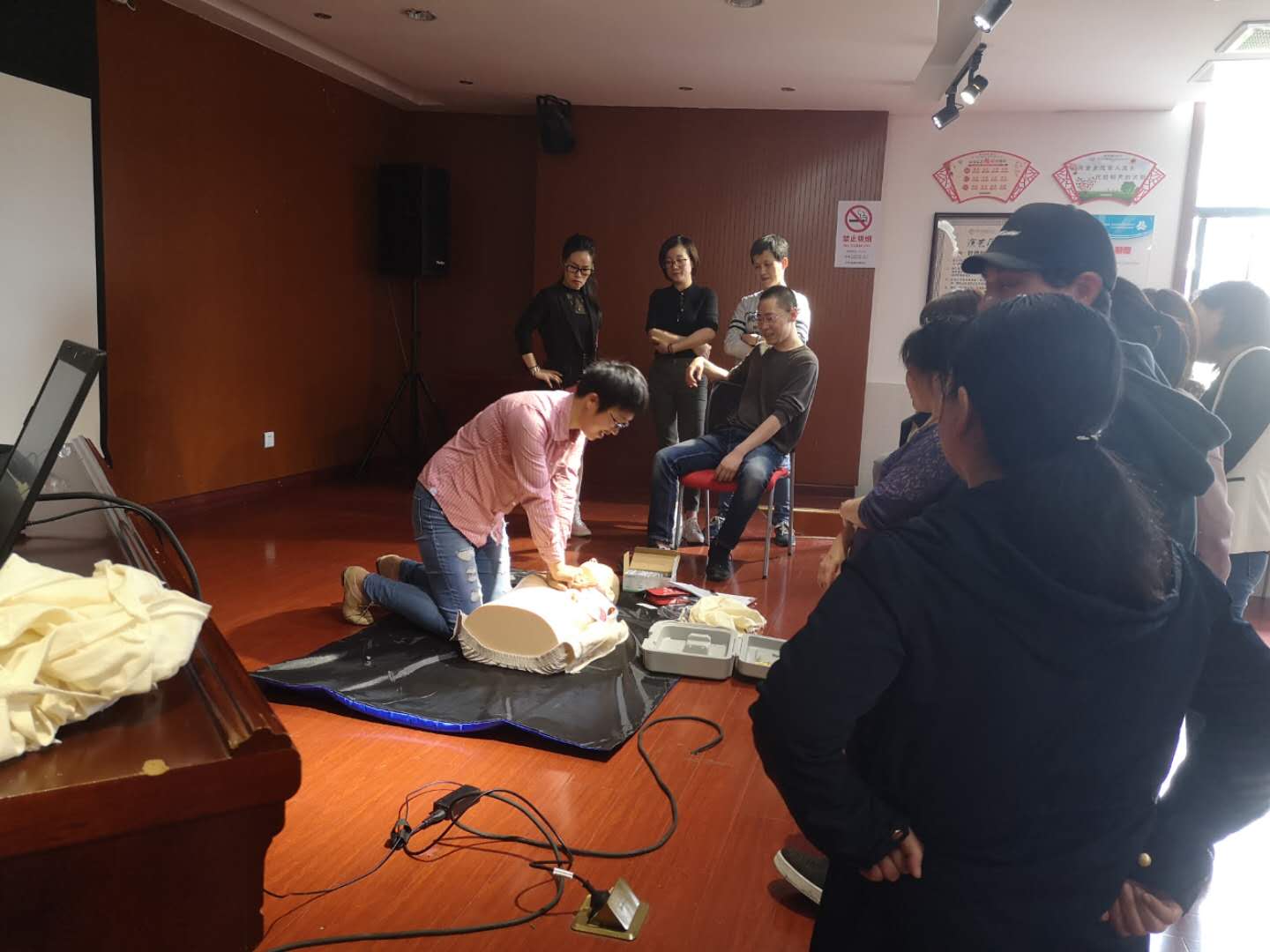 本次培训邀请了镇社区卫生服务中心尹茸巳医生为大家讲解急救知识、心肺复苏法、异物梗阻解除、烧烫伤急救、止血包扎、骨折固定、特殊伤现场处理基本技能等内容,采用理论知识讲授与实际操作相结合的方式,全面地考察了学员的急救理论知识和救护动手技能。