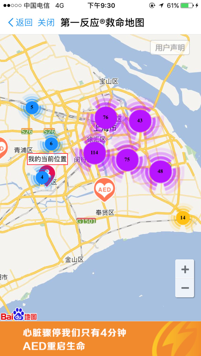 那么哪里有AED呢?去年我参加了医院组织的由红十字会进行的急救培训,在课上老师讲到现在上海对于AED的投放非常重视,估计2017年底在公共场所的投放量已达到1500台。同时也教了我们便捷寻找AED的方法,那就是打开支付宝→城市服务→医疗→AED地图,可以很方便地找到离我最近的AED装置,但是打开以后发现离方塔中医医院最近的AED在上海视觉艺术学院。老师当时说这个地图有一些落后,因为方塔公园和醉白池在近几年也已经投放了AED,可能是软件还没有进行地图的更新。遗憾的是,今天我再次打开AED地图,离我最近的仍旧是上海视觉艺术学院。缩小地图以后可以看到,松江区能显示的AED数量明显比较少,而市区的数量就很多了,但这也是相对而言的。对于上海这样有着2400万人口的城市来说,AED设置的数量还是偏少,至少需要4-5万台才能满足基本需求。