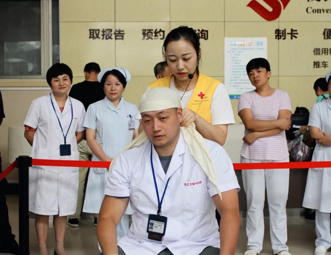 现场分别为呼吸骤停、头部外伤和肠外溢情况作了急救处理,现场进行施救演示的三位志愿者皆为该院医护人员,他们在去年和今年都获得了松江区红十字会举办的救护技能竞赛一等奖。