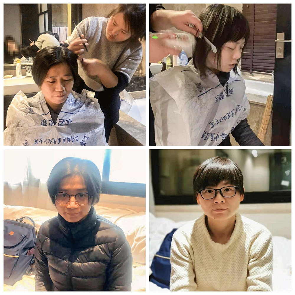 为了避免交叉感染,也为了节约穿脱防护衣帽的时间,邢丽莎临时充当起“Tony老师”,女孩子们毅然剪短了自己的长发。爱美赵小燕几乎没有犹豫:“剪吧,寸板头也没关系。”为了不让碎发沾满衣服,“理发师”邢丽莎找来一个塑料袋,稍作裁剪套在了赵小燕的脖子上,咔擦咔擦几下,齐肩的短发被剪至耳际,大家笑着说乖乖女一到武汉就成了假小子。