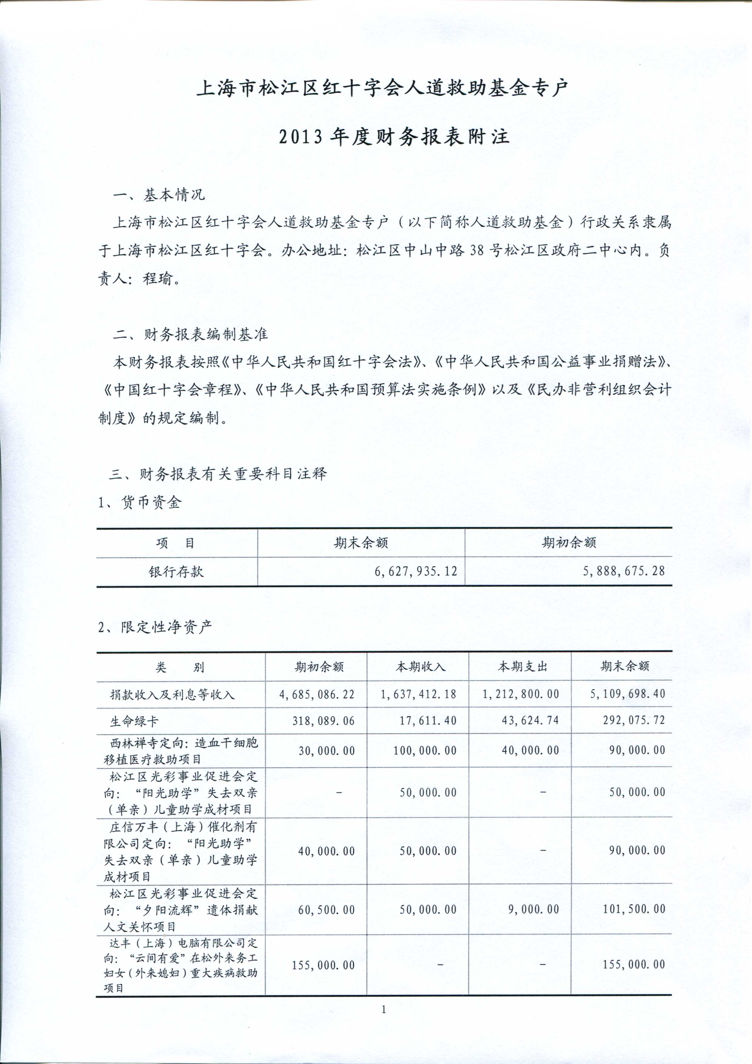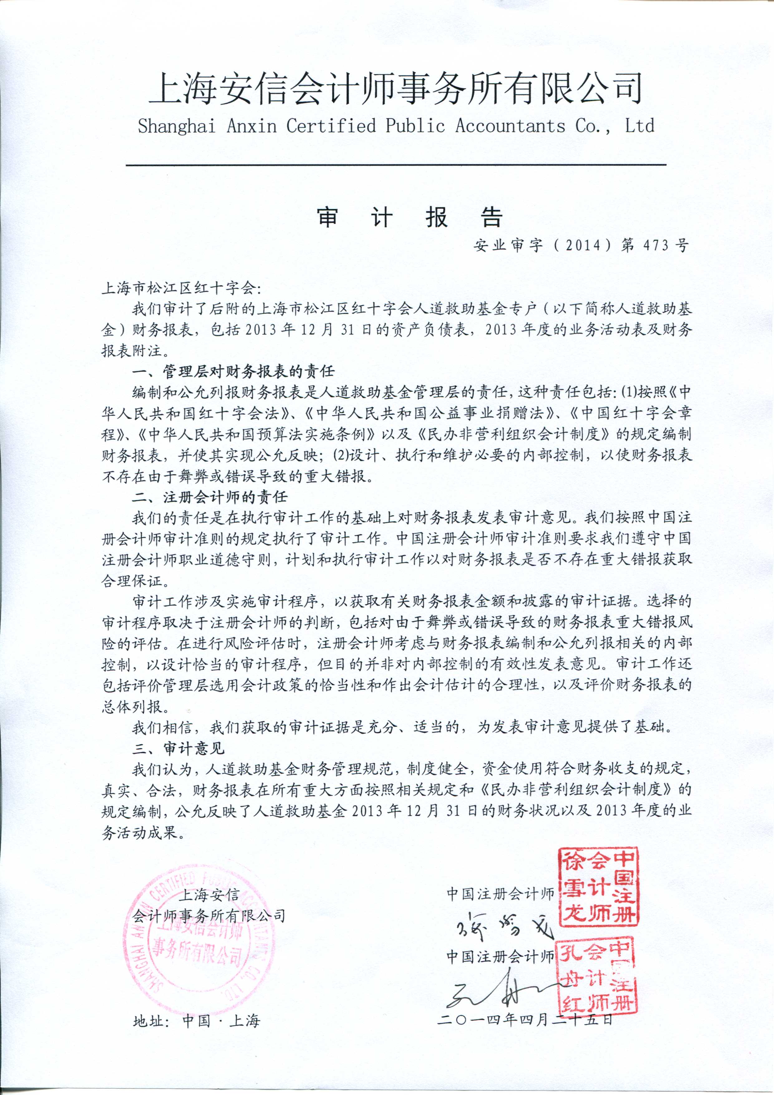 上海市松江区红十字会公示2013年度人道救助基金审计报告